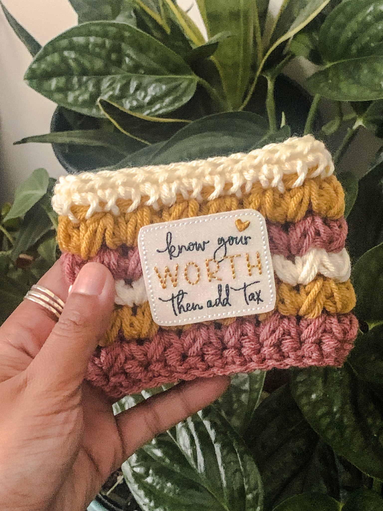 Keep your hands warm (or free from condensation if you’re enjoying a cold drink) this season with our “Know Your Worth then add tax” Cozy.